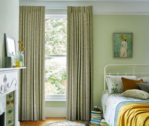 Sometimes mornings are just hard work, but when your bedroom is as fresh and gently alive as this, it's just a little bit easier. The soft green and yellow tones are the secret, with William Morris Sunflower Harvest curtains really highlighting the extra-long window, welcoming in the morning light, while soft floral touches in the bedding, fireplace tiles and the picture above the quietly create a curated theme.