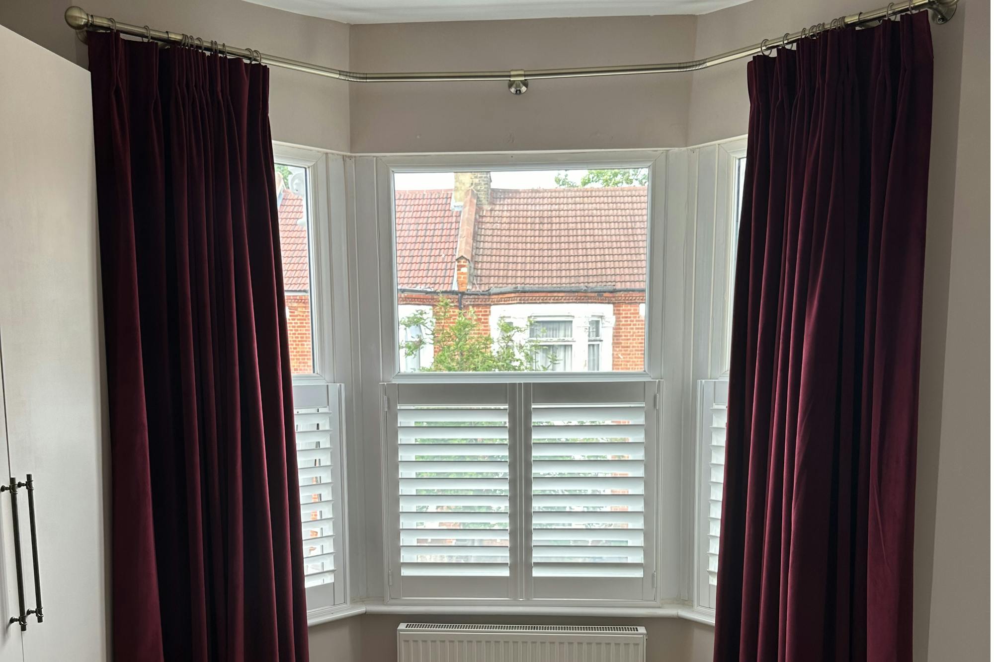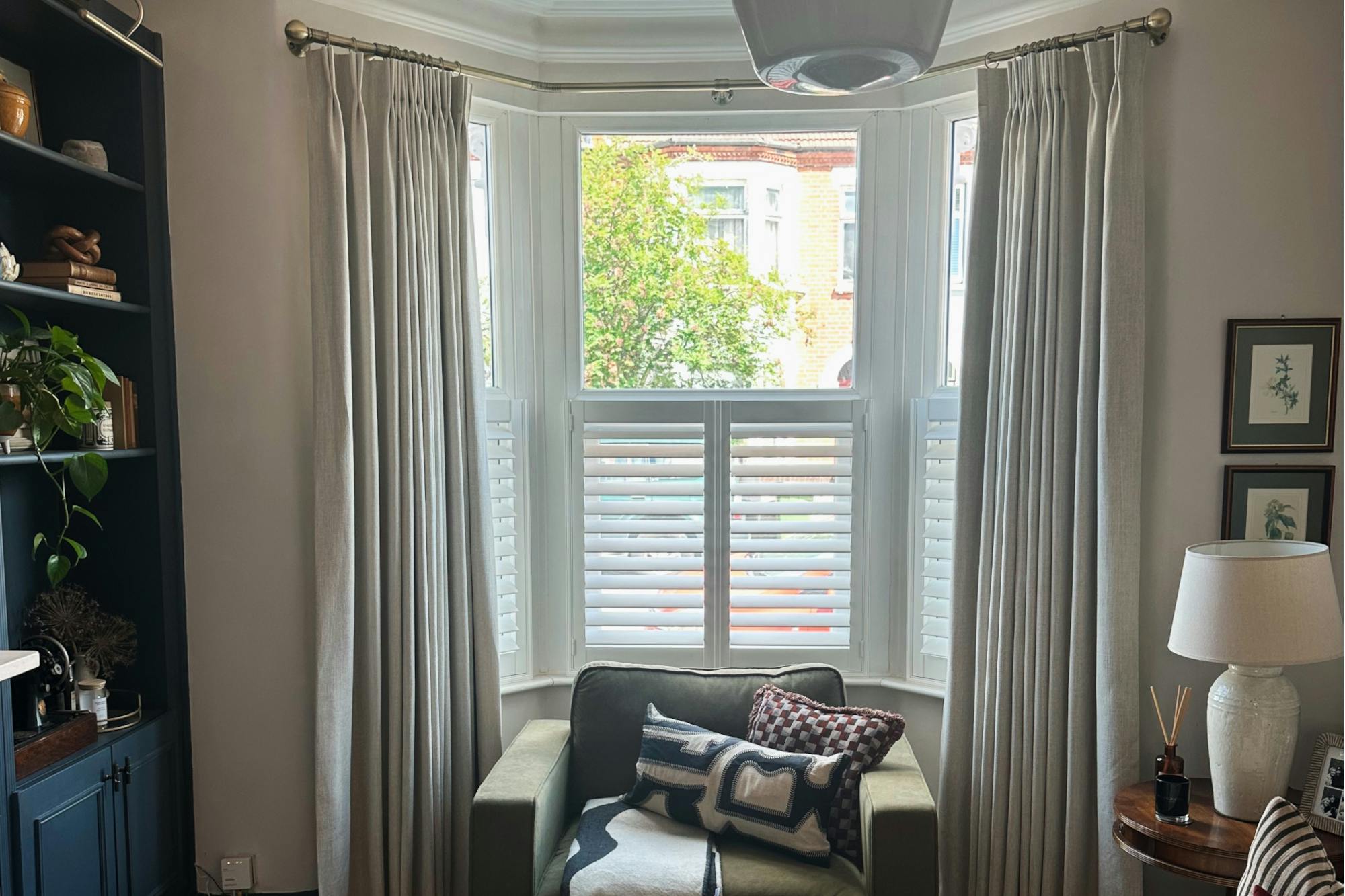Double pencil pleat curtains in Zara’s bedroom for a full, hotel-like finish, on top of existing café style shutters