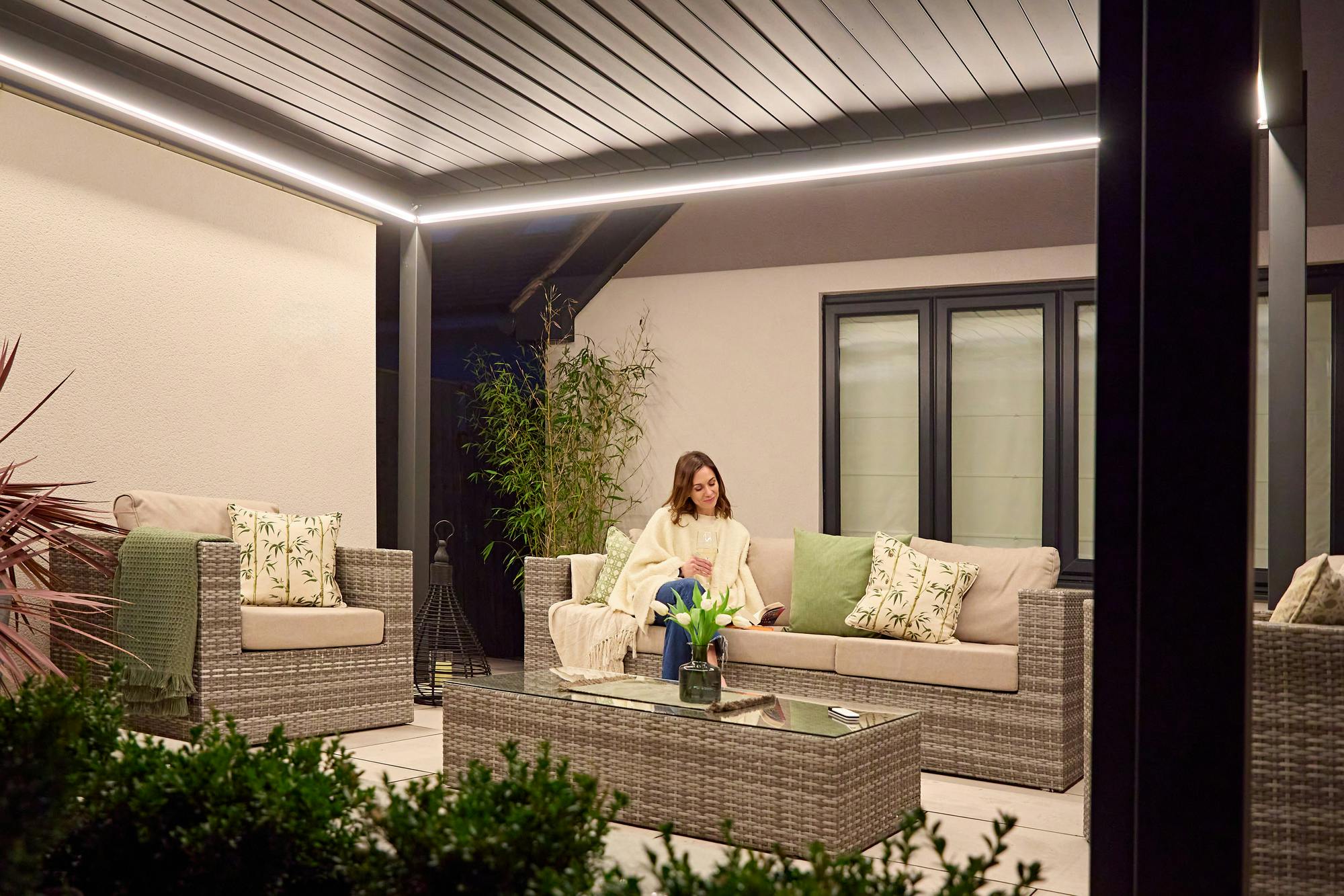 For those who love eating outdoors, a stylish dining setup is essential. Choose a durable design with comfortable chairs, and layer the table with linen runners, candles, and decorative tableware. Our pergola has integrated dimmable lighting, which is a perfect way to set the right mood. Add LED string lights with suction hooks, hanging lanterns on shepherds’ crooks and hurricane lamps to enhance the ambiance for evening meals.