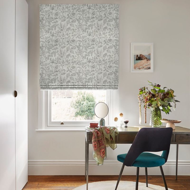 A Roman blind in Anika Silver is going to create a real focal point at any window you chose to use it. It’s all about the pattern with this fabric, but not in the normal way. No multi-colours, blockwork or geometrics here, but a flurry of flowers, leaves and stems in quite a large design, and from a distance it looks like a simple monochrome of black on cream, but get closer and you can see that it’s not actually a print but open-work embroidery, the delicate detailing making clever use of a wide variety of stitches to create a a real sense of depth to the pattern. It’s a Roman blind that will work just as well in summer as it will in winter, either on its own or paired with curtains.