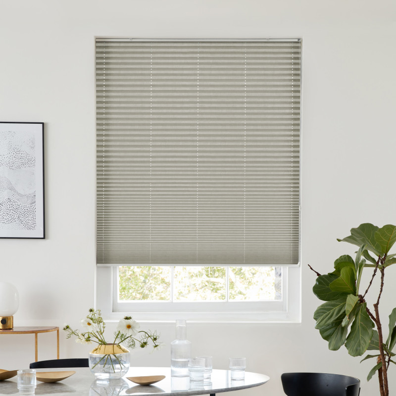 Blocks Greige is a Pleated blind that blends subtle texture with effortless versatility. Its jacquard fabric, crafted from 100% recycled polyester, features a soft grid-like pattern woven into a gentle greige tone; a perfect balance of grey and beige that adapts beautifully to both warm and cool interiors. There pattern is unstructured, as if scrubbed out in parts, so there’s nothing regular to it, so it’s a much more flowing affair, almost more a weave than a regular pattern. Calm and contemporary it’ll work really well in minimalist décor, neutral palettes or anywhere you want understated sophistication with a touch of texture.
