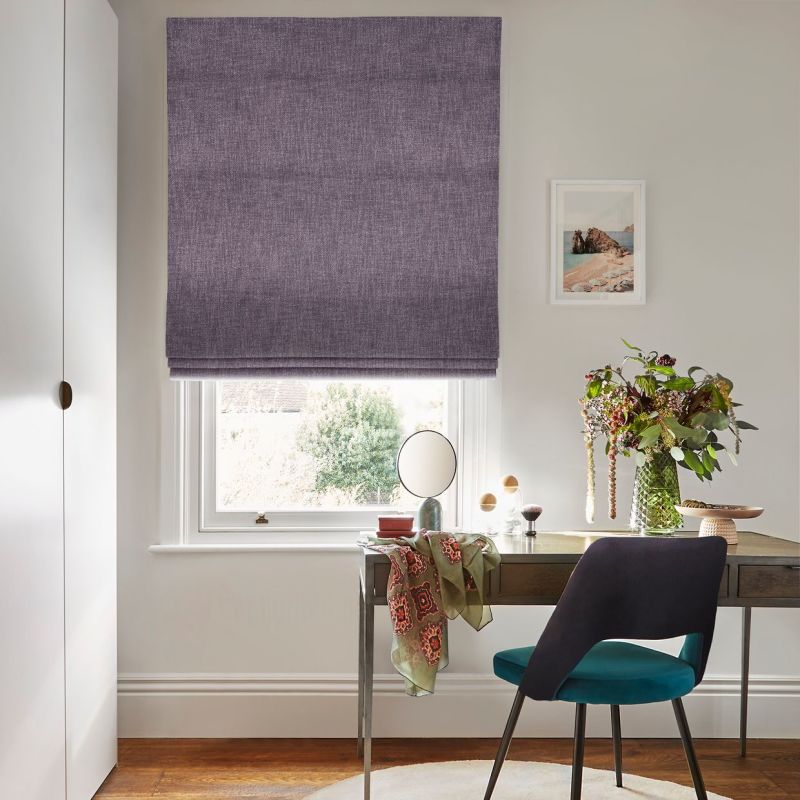 Brighten your view with something a little different in a Roman blind in Boheme Plum. Our Boheme range is inspired by the natural world around us and you can really see that in the colours and the texture of this fabric. Look up close and you’ll see the fabric has tiny blocks, the weave creating alternate raised and flat blocks across the length and breadth. This is because sum of the threads are spun polyester, so they don’t sit flat as the other threads do, creating this very tactile effect, bringing in flecks of a paler shade to the glorious feature colour. And what a colour it is – think unripe, almost smoky plums rather than the deep purple from your fruit bowl. Like lilac meets violet and finds that sweet spot in the middle. Beautiful on its own, maybe in a hallway or cloakroom or as one of a series in a bigger space.