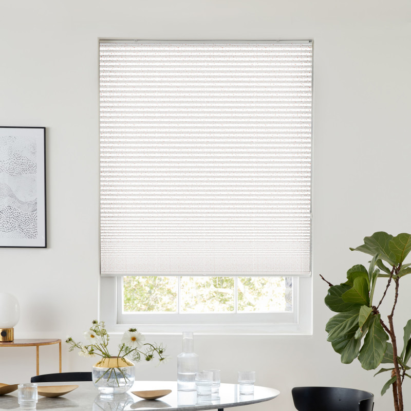 If you’re looking for a Pleated blind that can add a little touch of sweetness to a room then look no further than Coco Candy. With its pattern of irregular dots in a pale brown-pink scattered across a white background, the fabric feels like a modern take - light, cheerful, and full of charm. The blind’s crafted from 100% recycled polyester, which gives it a subtle texture that catches the light beautifully, while the solar reflective coating works quietly behind the scenes to keep your room comfortable on warmer days. This blind is perfect for spaces that need a lift, whether it’s a playful pop in a neutral room or a soft accent in a pastel palette. Coco Candy brings warmth, whimsy, and a little bit of joy to your windows, all wrapped up in a design that’s as practical as it is pretty.