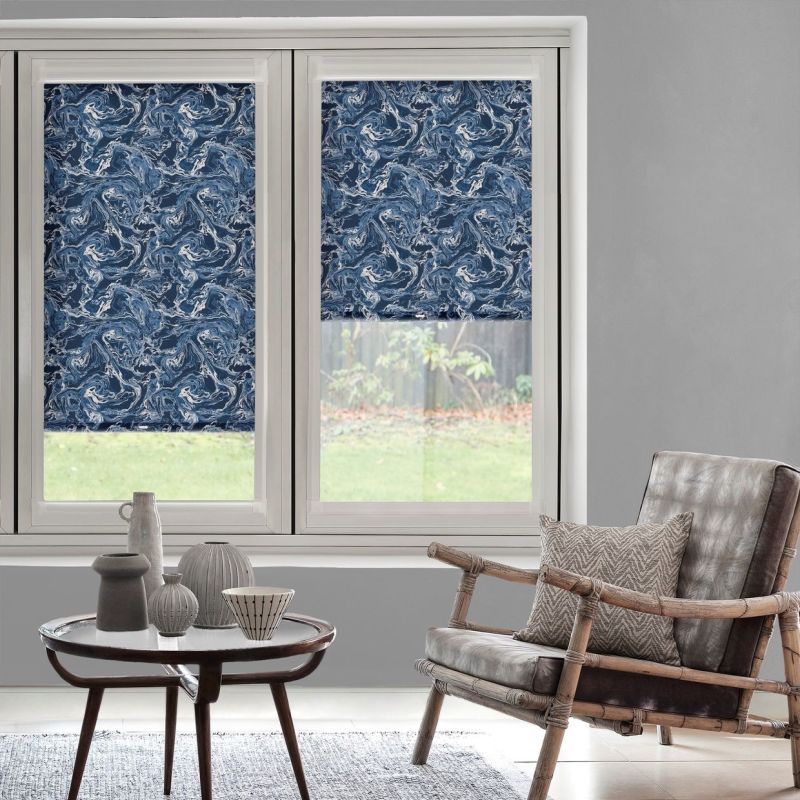 Dive into the luxurious beauty of the Marble Aquamarine Roller blind and add a touch of unexpected flair - and a whole lot of class - to your room. Featuring a design of swirling blues rippling and flowing like lava across the moisture resistant fabric, this Roller was born for bathrooms, and glamorous bathrooms at that. Creating a striking yet sophisticated décor scheme, especially when accompanied with white marble tiles, a touch of gold and ornate pieces, Marble Aquamarine plays tricks on the eyes, cleverly persuading you that the tornado of shapes is subtly moving, ebbing and flowing like a great body of water commanding the scene. For a little less drama in your décor pick out the softer shades of blue and creamy white lines to add a serene touch to a modern scheme.