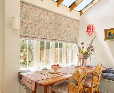 Made to measure is our speciality and when you have unusual windows in your home, you need experts to help you find the ideal solution. This dining nook makes clever use of this corner, but with a full expanse of windows, not to mention the ones above, light control is an absolute must. Crafted to the exact specifications of the window, these side by side Roman blinds are just perfect. Go electric and they'll open and close with a remote so you won't even have to clamber round the table to reach them.