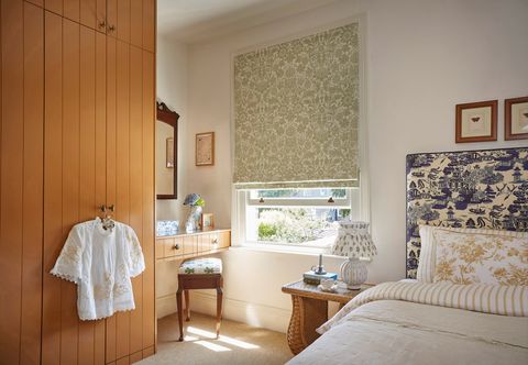 One of the most important things to think about with window dressings in a bedroom is privacy and how to balance it with light. This double blind combi is a change from the more common blind and curtain pairing and it's really effective. The Roman blind, in our new William Morris Strawberry Thief Dawn fabric, brings the colours to co-ordinate the room together, while the white wooden blind works the privacy angle.